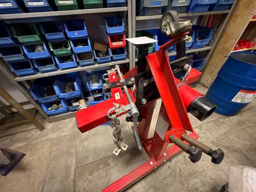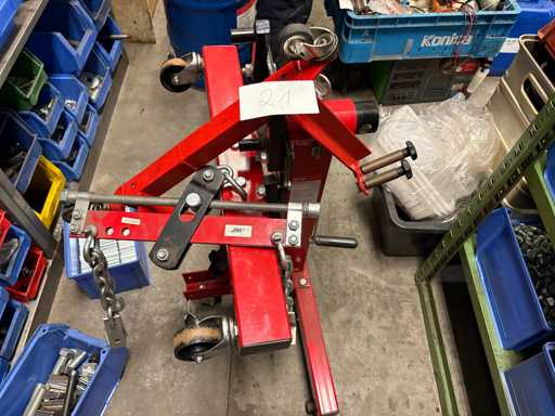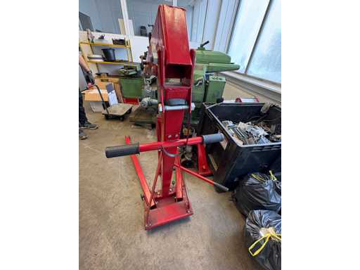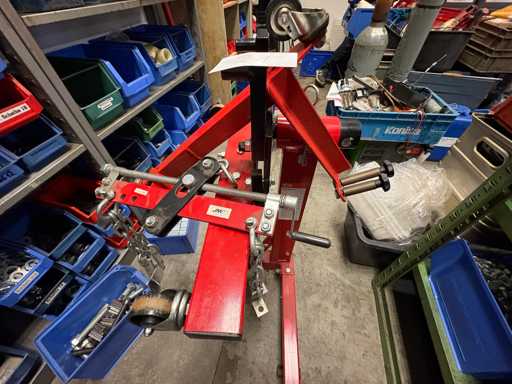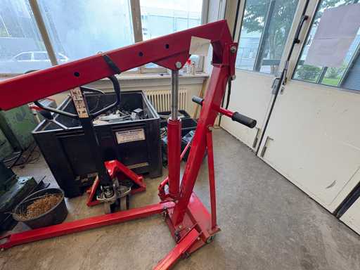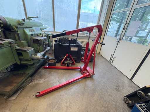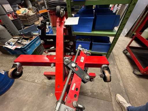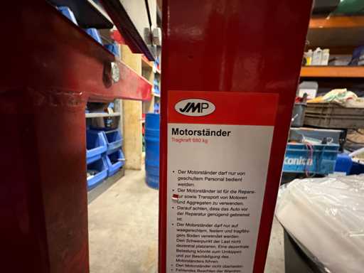 Fabrikant: JMP Set bestaande uit: Motorstandaard (draagvermogen 680 kg) met verstelbare lastarm en kettinghouder, verrijdbaar op zwenkwielen Hydraulische motorkraan / werkplaatskraan met zuigerkrik 3 t, inklapbare boomarmen, stalen rolchassis Solide, zware werkplaatsuitrusting voor motor- en versnellingsbakreparatie Massieve stalen constructie, rood gelakt Toepassing: Motorvervanging, reparaties, werkplaatsbediening Conditie: gebruikt, functioneel, met normale gebruikssporen