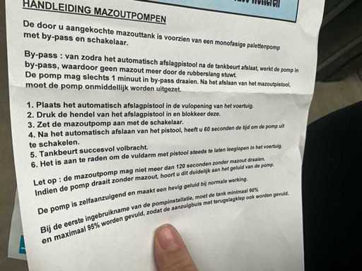 220V. Pompen 40-60 L/M met telwerk. 1 x 10 meter flexibel. Bouwjaar zal rond de 2021 liggen. Mazouttank is dubbelwandig.