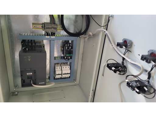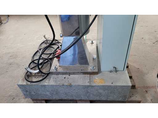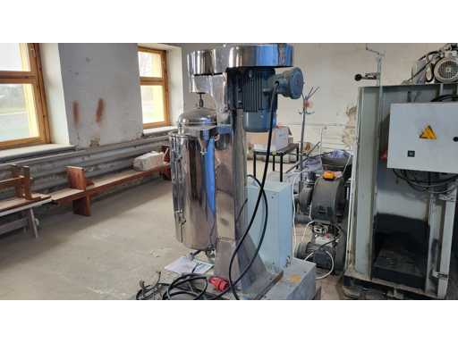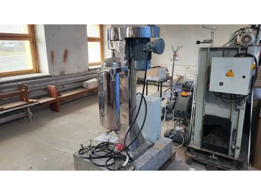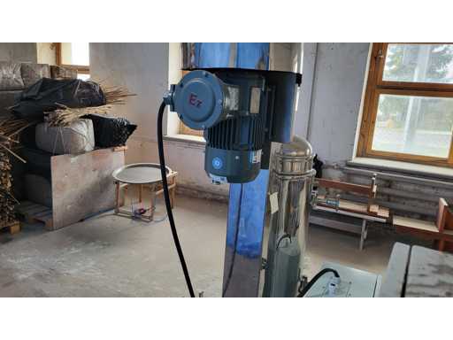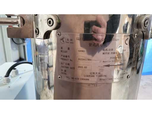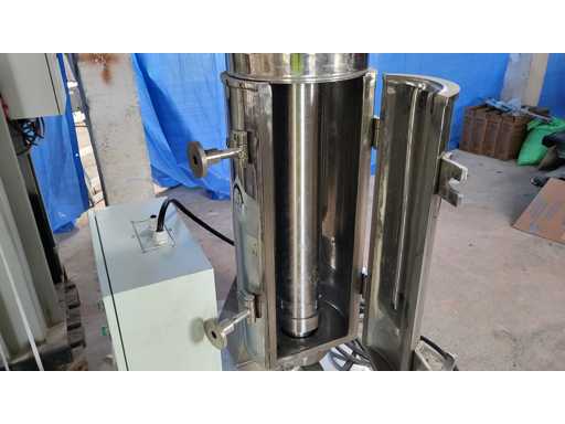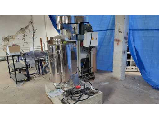Deze centrifuge is ontworpen voor de scheiding van vaste deeltjes. Het wordt gebruikt in de voedingsindustrie, met een lage kilometerstand. Doel: Scheiding van eiwitten, bacteriën en klaring van wijnen, sappen en oliën. De regelbox maakt snelheidsregeling mogelijk met een maximale centrifugale kracht van 17.000G (18.000 tpm). Vaste deeltjes zakken in de 7L kom. De centrifugecapaciteit is 300-700L/u, afhankelijk van de dichtheid van de gescheiden mengsels. De centrifuge is volledig gemaakt van 316L staal en wordt aangedreven door een 3kW motor. De centrifuge is uitgerust met verwisselbare sproeikoppen, waardoor vloeistoffen met verschillende viscositeiten en dichtheden kunnen scheiden. De centrifugeaansluitingen zijn uitgerust met triclampconnectoren en een 50mm schijf. De centrifuge is CE-gecertificeerd. De centrifuge wordt geleverd met: