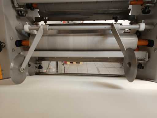 Vermogen: 1,5 kW • Spanning: 220 V • Aanvullende opmerkingen: Industriële deeglamineermachine met geïntegreerde trechter, rollen en schuine transportband. Ingebouwde veiligheidssensoren en noodstop. Maximale rolbreedte est. 600 mm.