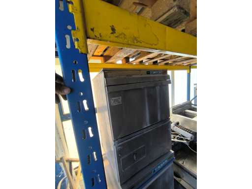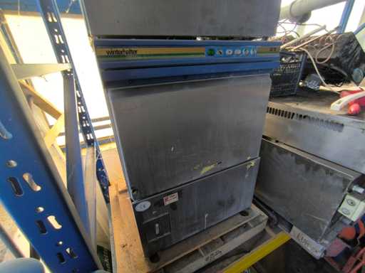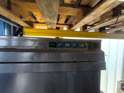 Industriële vaatwasser met voorlader met handmatige bedieningsknoppen en cyclusindicatoren.