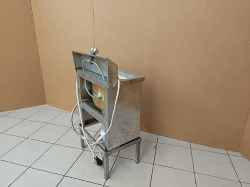 Roestvrijstalen verwarmde spoelbak voor sterilisatie van messen, elektrische dompelverwarmer geïntegreerd met thermostaat en thermometer, gemonteerd op een hygiënische standaard.