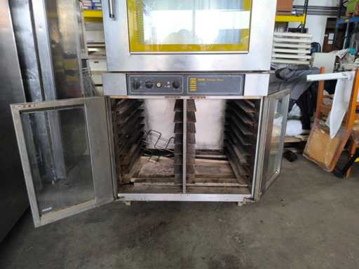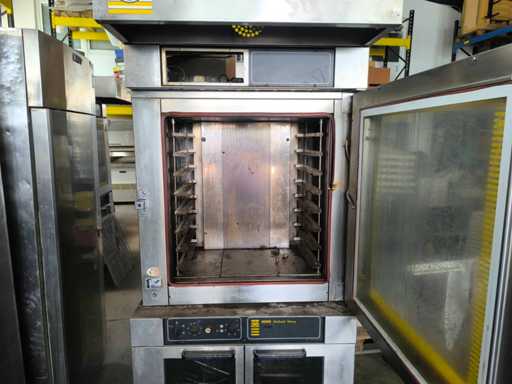 Commerciële heteluchtoven met geïntegreerde stoominjectie, analoge bedieningsknoppen en rijskast eronder. De rijskast heeft dubbele glazen deuren en meerdere ladesleuven. De ovenkamer ondersteunt 8-10 niveaus.