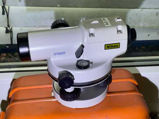 Automatisch nivelleringsapparaat van het merk Nikon, met name het AZ-25-model, Dit type nivelleringsapparaat wordt gebruikt om zeer nauwkeurige horizontale vlakken en hoeken te meten, ze hebben krachtige optica voor heldere en scherpe beelden, zelfs bij slecht zicht, het apparaat is gebouwd om robuust en waterbestendig te zijn, waardoor het geschikt is voor gebruik buitenshuis, het bezit een ingebouwde magnetisch gedempte compensator, die automatisch de zichtlijn nivelleert. Inclusief 1 x beugel, serienummer: 876097