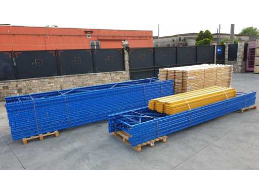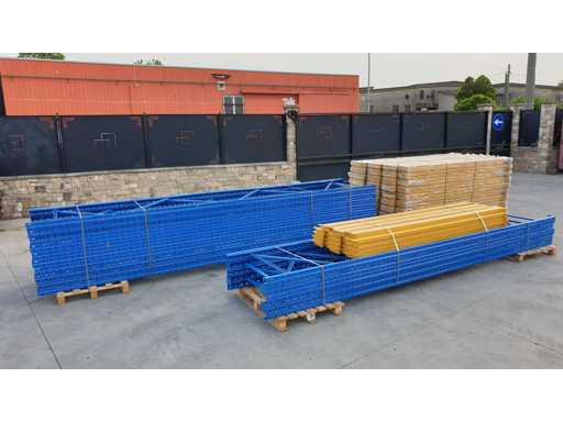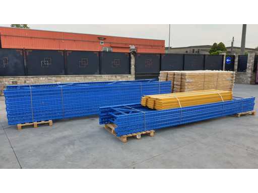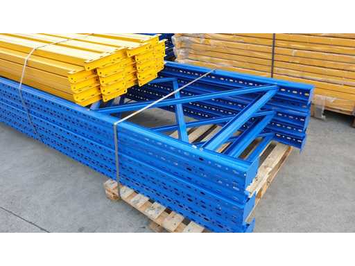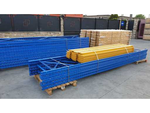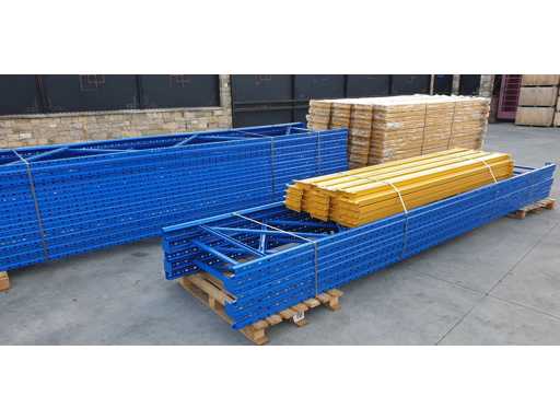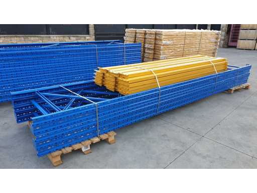 Palletrekset voor een lengte van 53 meter, set bestaande uit 20 schouders van 5000 x 1000 mm + 114 balken van 2700 mm lang in geel met een capaciteit van 2500 kg per verdieping, de planken worden geleverd in originele verpakking, al gedemonteerd en klaar op pallets