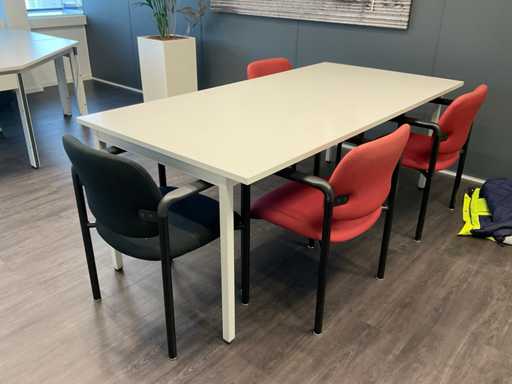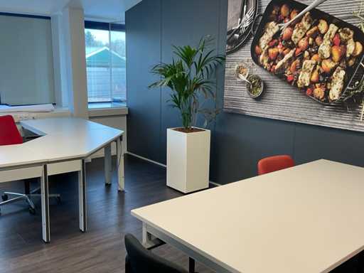 w.o. hoekbureau; vergadertafel met stoelen; plantenbak; porte-manteau en whiteboard