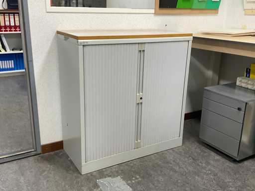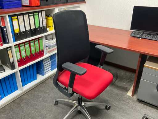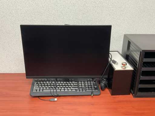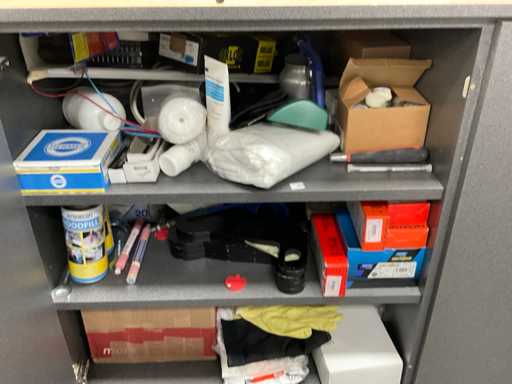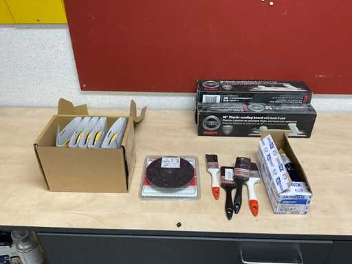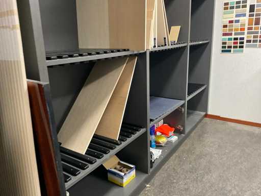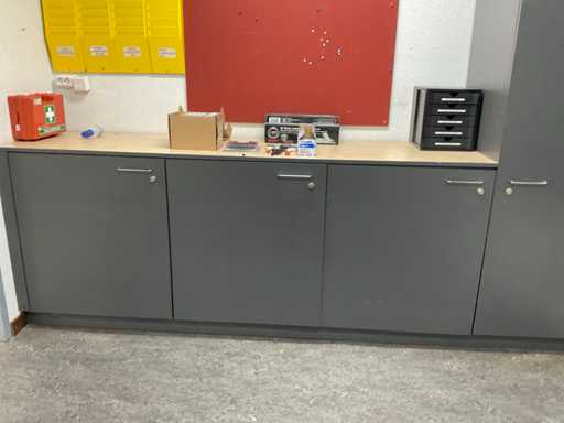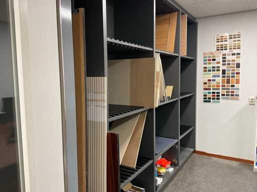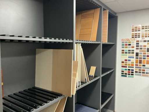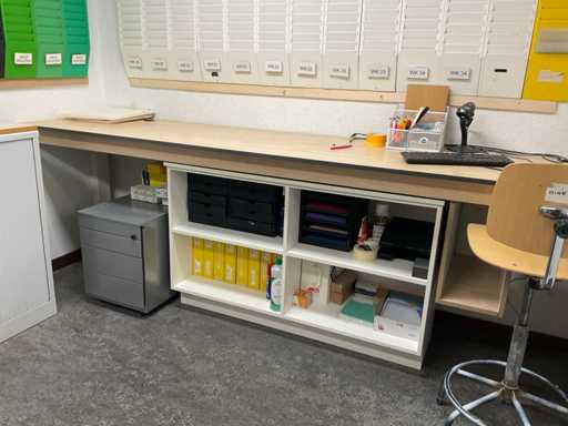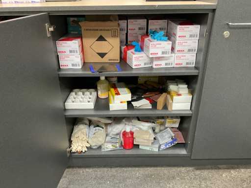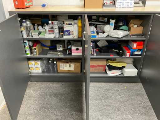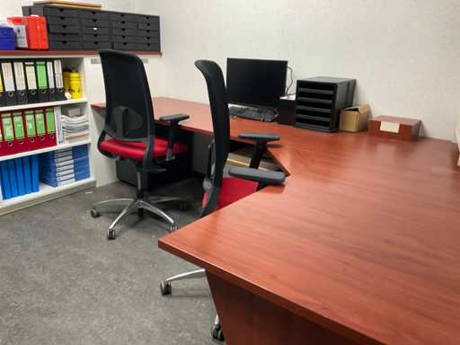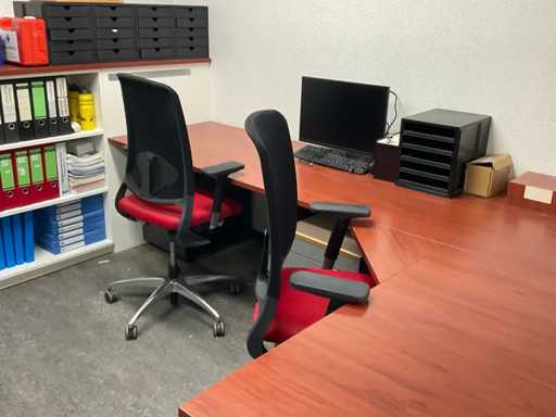 w.o. hoekbureau met bureaustoelen; wandkasten met inhoud; vakkenkasten; monitor; gereedschappen; hang- en sluitwerk etc.