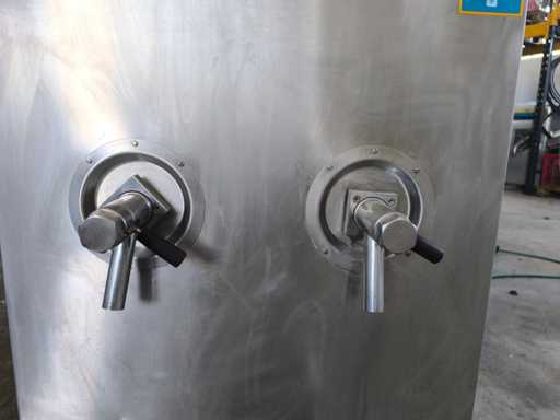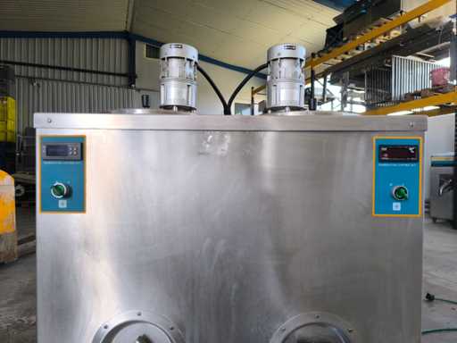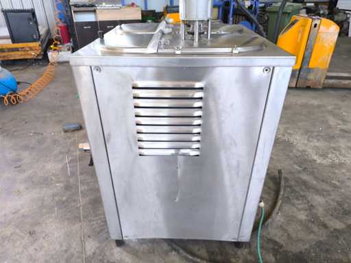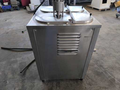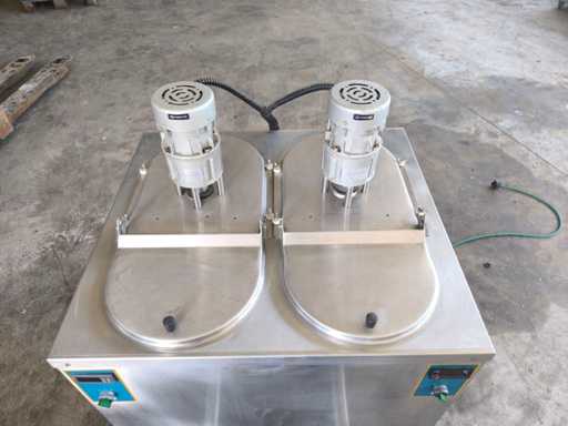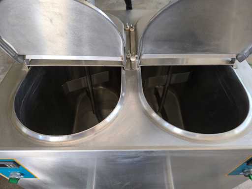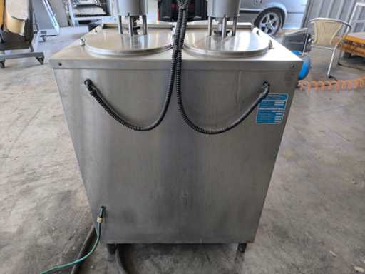Pasteur met dubbele tank voor de bereiding van room of gelato. Uitgerust met temperatuurregeleenheden voor elke tank, roerwerkmotoren en dubbele roestvrijstalen tapkranen.