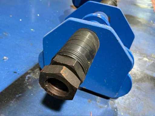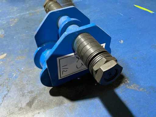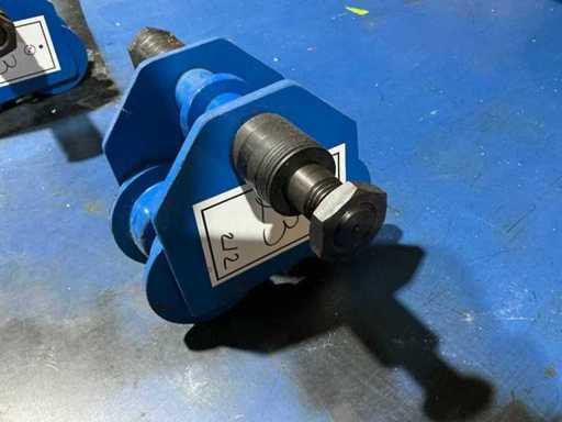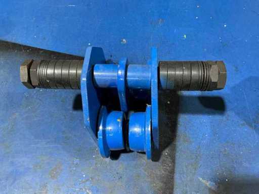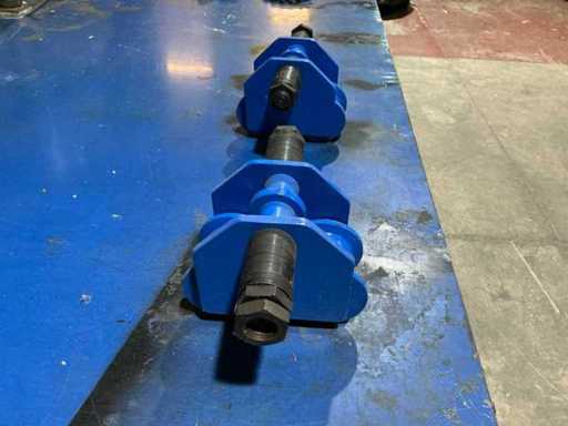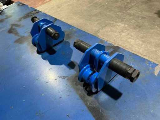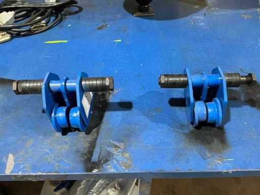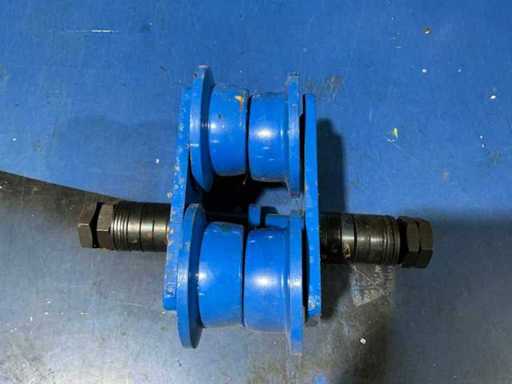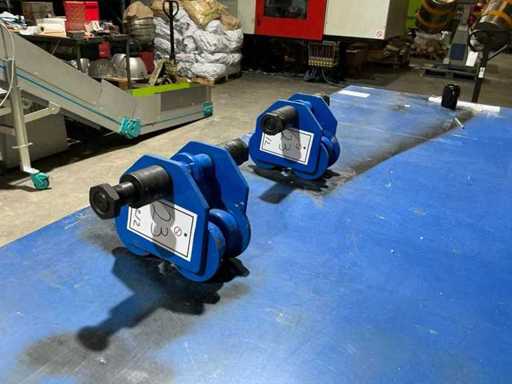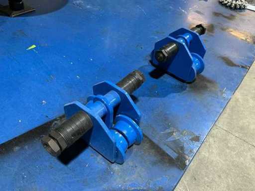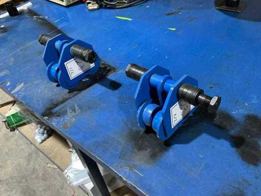 Adjustable blue-painted steel trolleys with double flanged wheels and connecting axle for smooth load handling along steel beams.