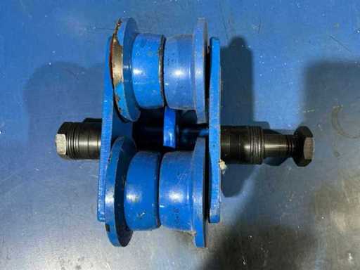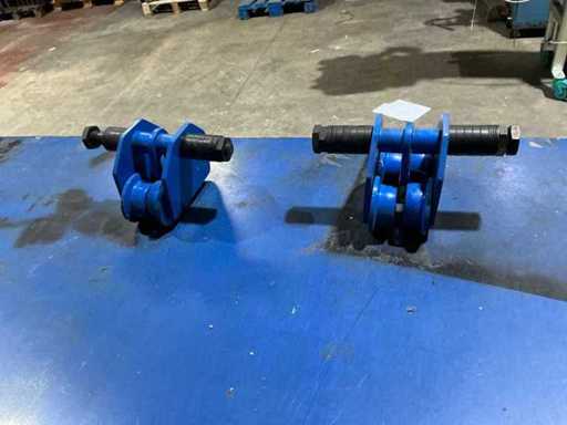 Pair of heavy-duty overhead crane trolleys for I-beam monorail systems, each approx. 35 x 25 x 20 cm