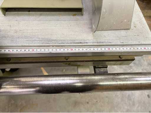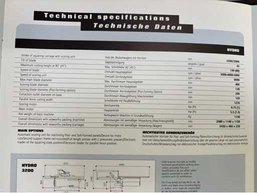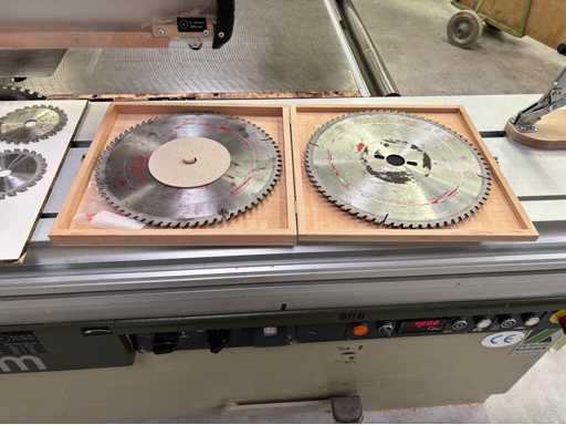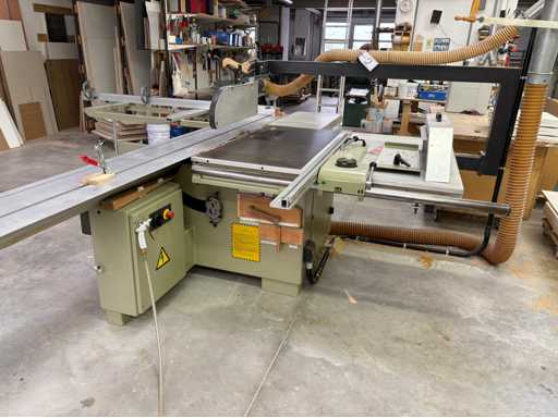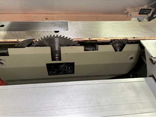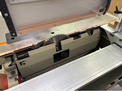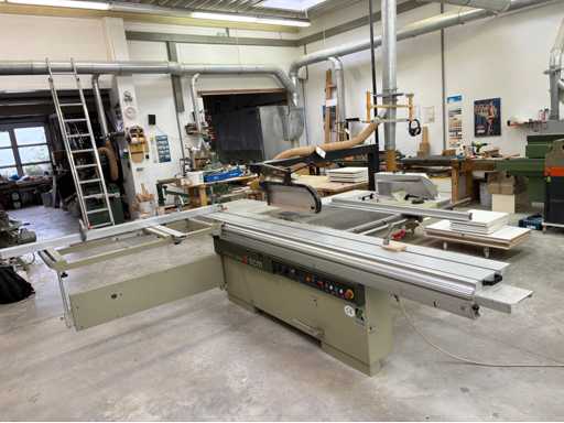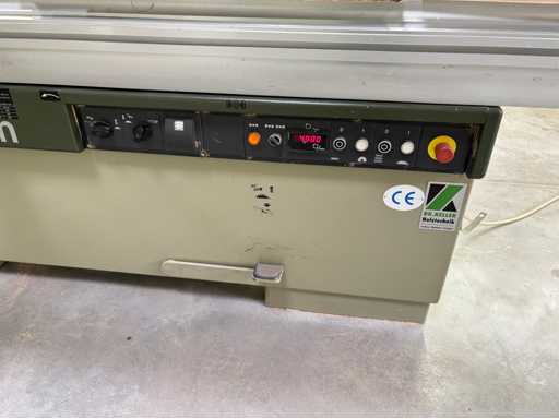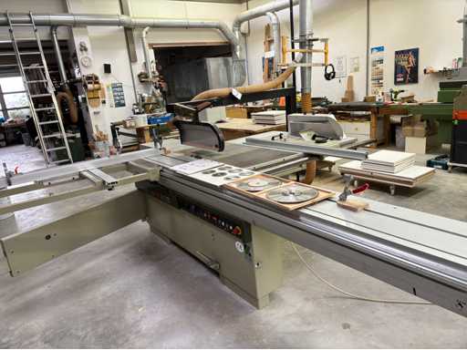Machine nr. AB 097353, snijlengte ca. 3200 mm, snijbreedte parallel hek maximaal ca. 1300 mm, hoofdzaagmotor ca. 5,5 kW, snelheid ca. 3000/4000/5000 tpm, hoofdzaagblad diameter maximaal ca. 400 mm, snijmachine ca. 0,75 KW en snelheid ca. 9000 tpm, zaagunit draait hydraulisch via voetstap, zaagbladen en accessoires (het artikel is in staat zoals bestaande en ongecheckt). De kosten voor demontage en laden zijn bindend en het item wordt verkocht zonder inhoud/materiaal!)