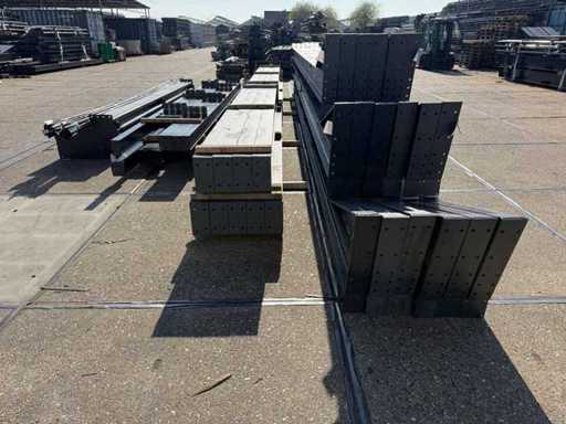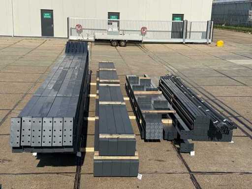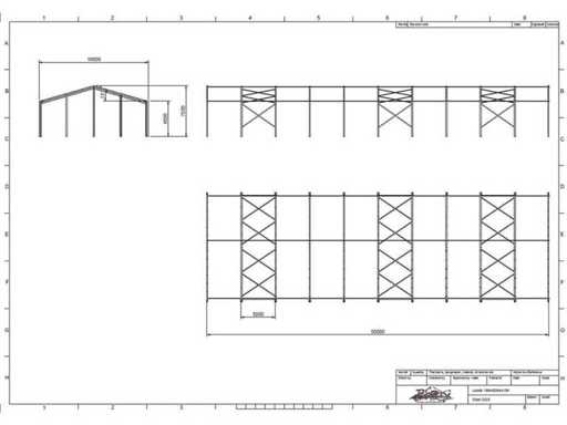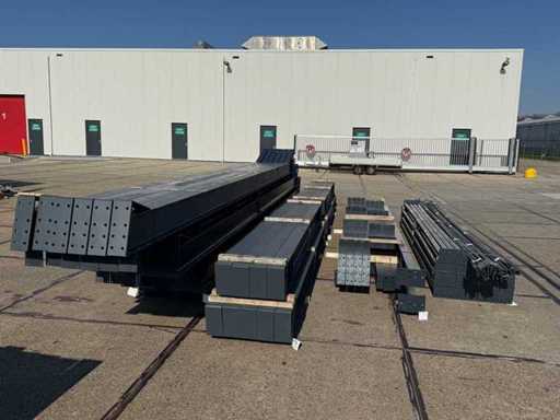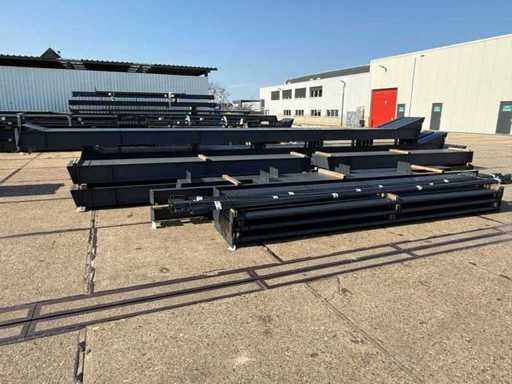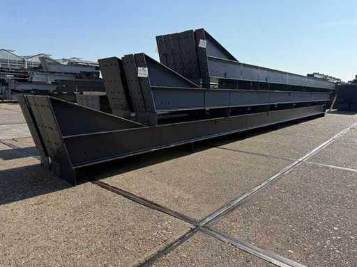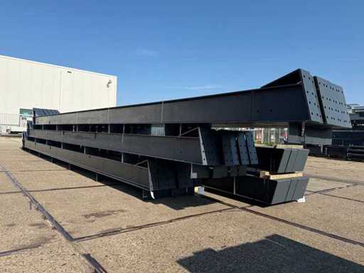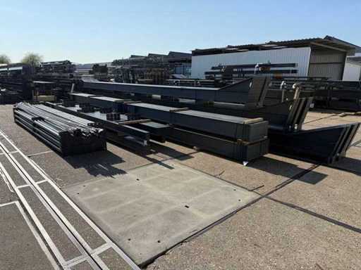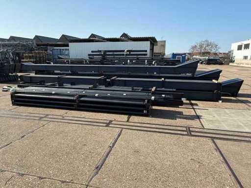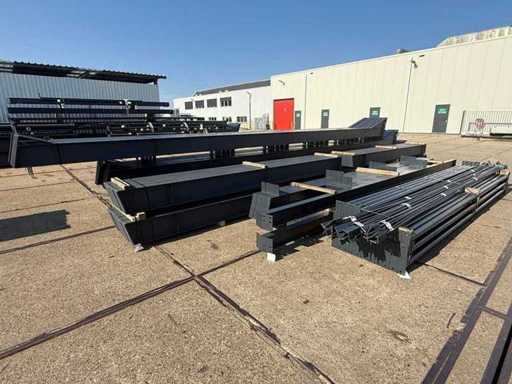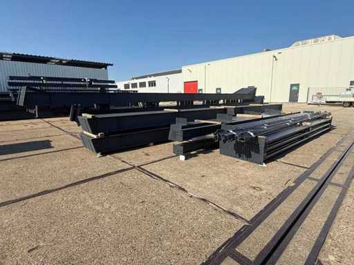 vrije overspanning; spanten h.o.h. 5000mm; dakhelling 15 graden; 9 sets tussenspanten IPE300/270; 2 sets eindspanten IPE180 met windstijlen; staaltekening; 3D-tekening; voorzien van drukkokers; windverbanden; kruisschoren; gordinglippen op de spanten; kavel ligt netjes transportklaar en dient met 1 trailer opgehaald te worden; kavel wordt gratis met een heftruck geladen