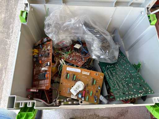 De dozen zijn gebruikt maar volledig functioneel, in de kleur lichtgrijs met groene sluitingen, meestal gelabeld en ideaal voor mobiele toepassingen of werkplaatssystemen.