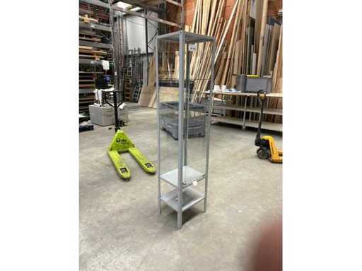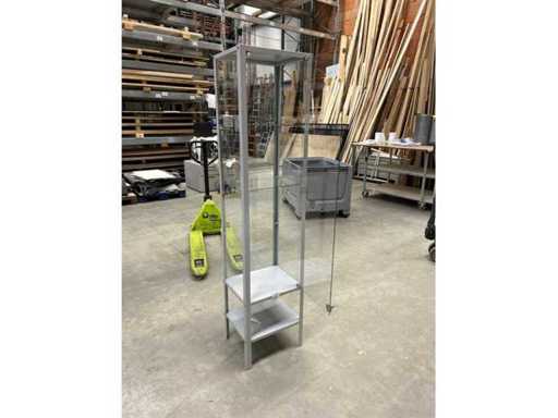 Vitrine, staal, lichtgrijze ruiten. Echt glas met glas aan vier zijden, twee planken. Glazen deur op slot met sleutel.