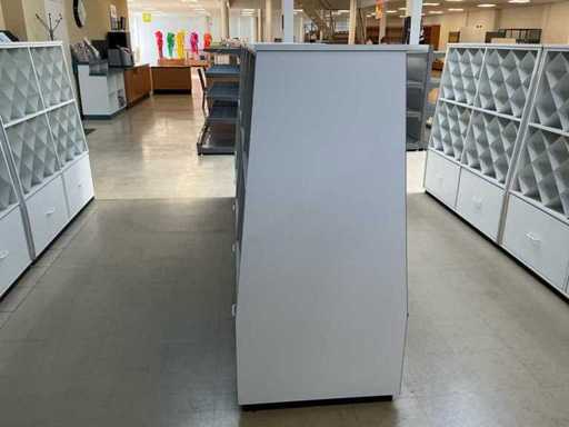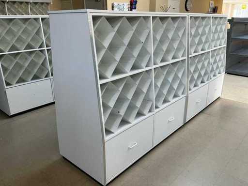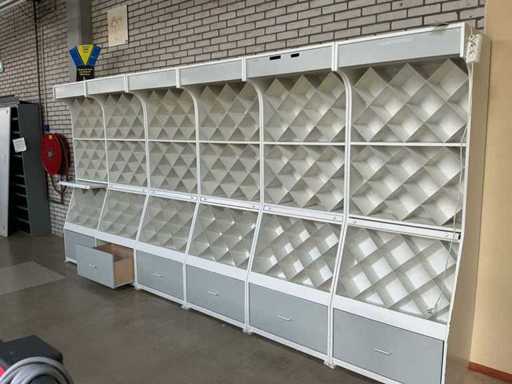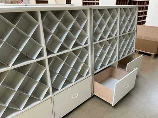 Voorzien van: 12 Knoopkasten, met lades. dubbelzijdig. lades aan 1 kant te openen. Inclusief 6 losse knoop stellingen van 74cm breed x 210cm hoog met presentatie la en opberg lades.Zie laatste foto’s.