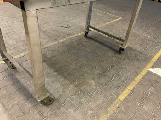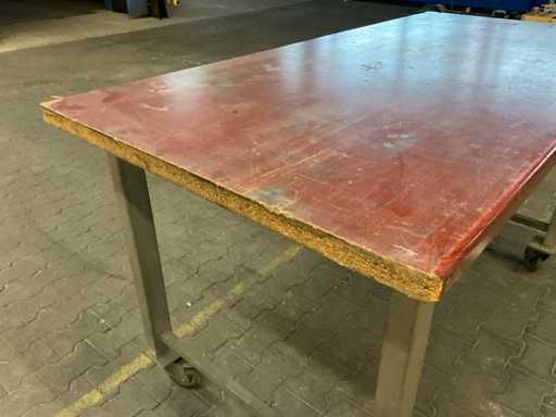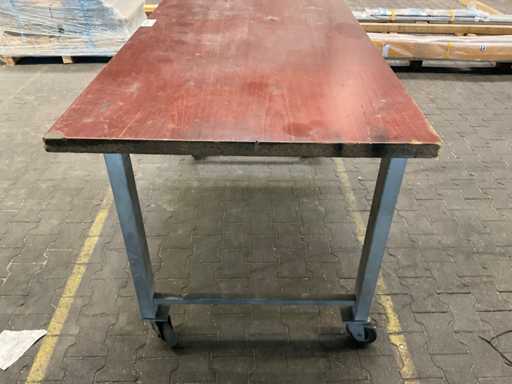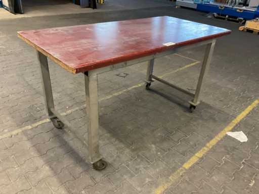 Hij heeft zwenkwielen (bokwielen en vergrendelbare zwenkwielen), waardoor hij mobiel is, De constructie is gemaakt van gelast plaatstaal, Het werkblad is geolied en heeft een dikte van 40 mm.