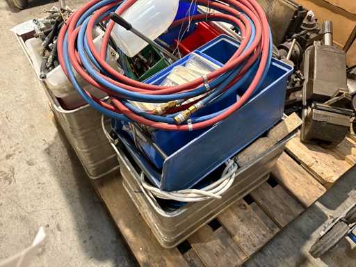 Diverse werkplaatsartikelen: kitten, spuitbussen, kabels, kleine containers, slangen, plastic dozen