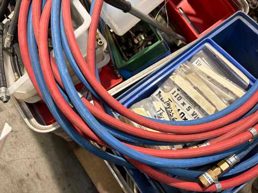 Enkele meters hydraulische en persluchtleidingen (rood/blauw, zwart)
