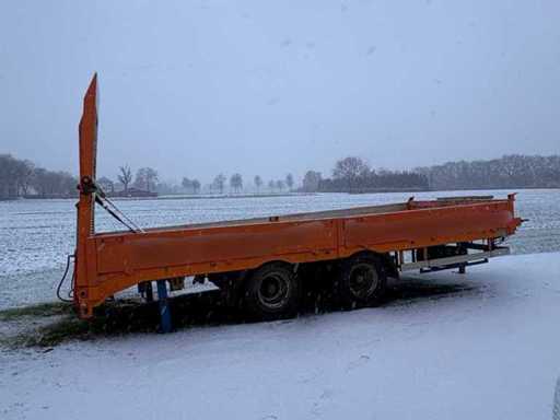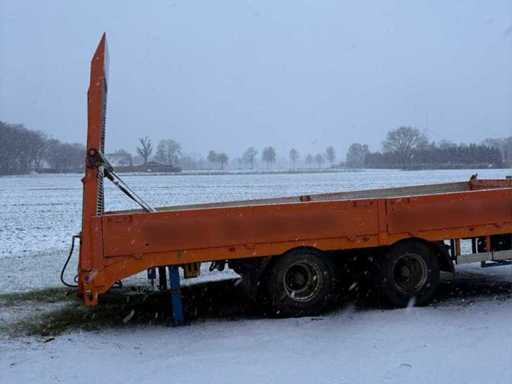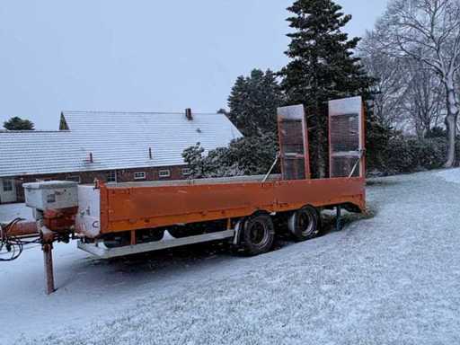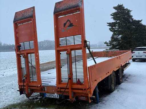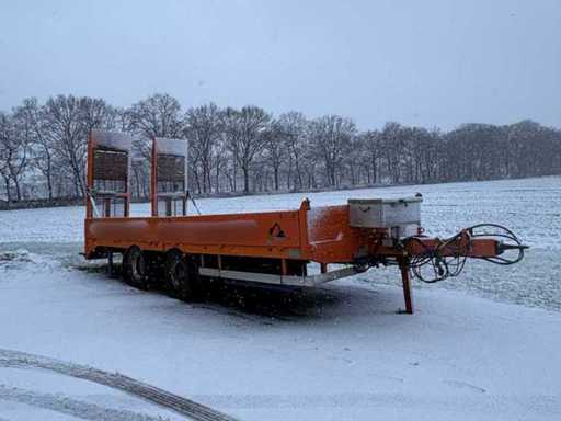 For sale is a low-loader / machine trailer in tandem design, used in the field of road construction, civil engineering and general construction site use. Ideal for transporting construction machinery, equipment and heavy equipment, the trailer is equipped with ramps that allow for comfortable and safe loading and unloading.