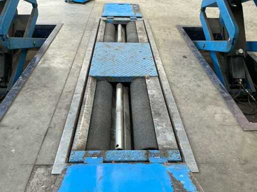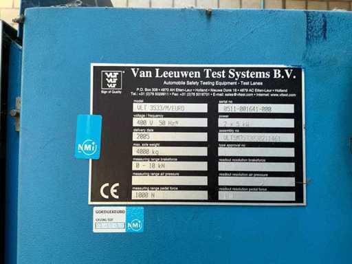 Składa się z: Van Leeuwen Test Systems B.V., typ: VLT 3533/M/EURO, rok produkcji: 2005, zasilanie: 400V / 50 Hz, moc silnika: 2 × 5 kW, maksymalne obciążenie osi: 4 000 kg, zakres pomiaru siły hamowania: 0–10 kN, zakres pomiaru siły pedału: do 1000 N, podwójne analogowe zegary wyświetlacza (L/R), w tym zdalne sterowanie, wbudowana jednostka rolkowa o szerokości napędu 850 mm, środek do środka około 1800 mm.