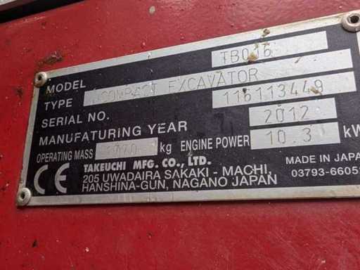 2012 TAKEUCHI TB016 mini excavator incl. 3 buckets + ditch cleaning bucket – ready for immediate use
