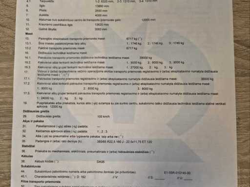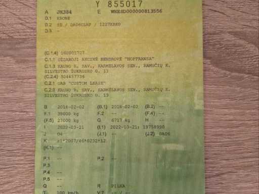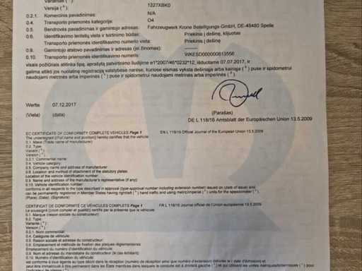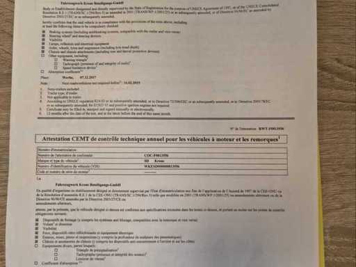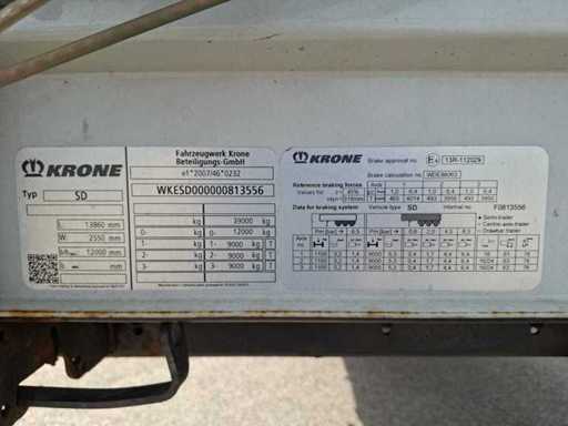 Krone SD curtainsider semi-trailer from 2018 in neat, ready to use condition. Equipped with 3 axles with air suspension, curtains, sunroof and double rear doors. European documents (Estonia) available including type approval and ECMT certificate. Vehicle must be imported by buyer in the country of destination. Maximum permissible gross weight 39,000 kg. Ideal for international transport. Normal signs of wear appropriate to age and deployment - specifications: Sliding tarpaulin left and right, Sliding roof, Aluminum side boards, Wooden floor suitable for pallet transport, Rear doors (double doors), ABS / EBS brake system, Drum brakes, Lift axle, Spare wheel holder, Rear bumper according to EU standard, Speed stickers 60/70/80 km/h, ECMT / CEMT certificate available, European type approval document available, suitable for 33 euro pallets