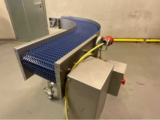 Marvu Blue Modular Belt Conveyor, Model 1000-7801/P10, designed for food and beverage or packaging applications. – Brand: Marvu – Year: 2018 – Bending angle: 90° – Voltage: 400 V / 50 Hz – Stainless steel structure – Blue modular plastic tape – Green HDPE side guide – Casters – Electrical box with emergency stop