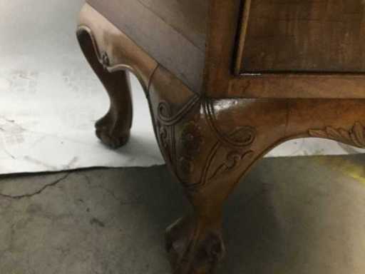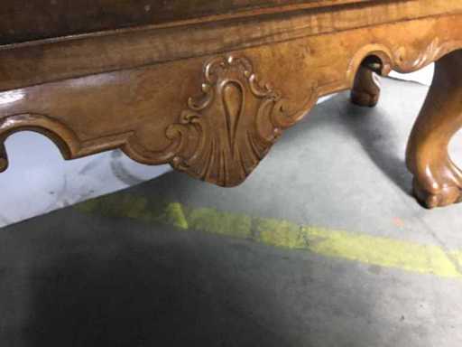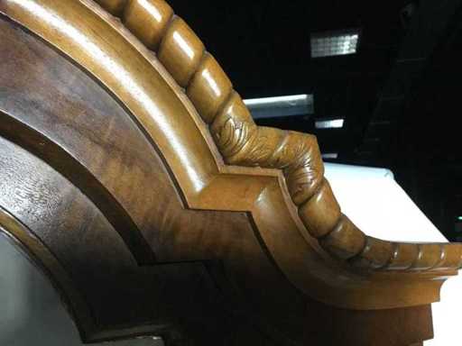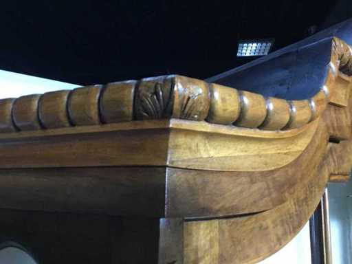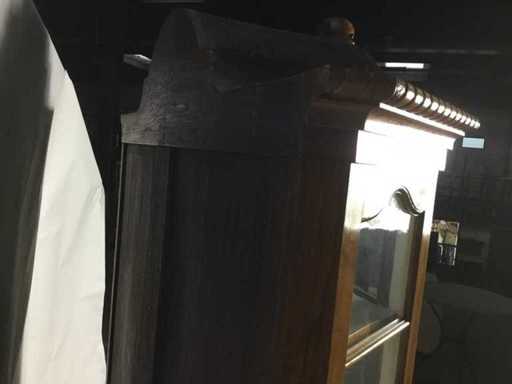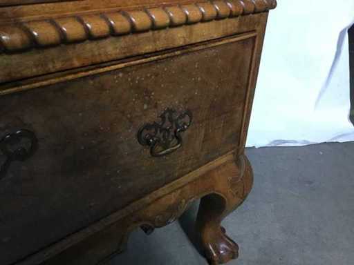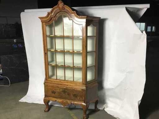 Ten mebel to holenderska szafka na porcelanę lub witryna wystawowa, prawdopodobnie wykonana z (korzeniowego) orzecha włoskiego. Takie gabinetki często wykonywane są w stylu historycznym, takim jak Ludwik XV czy barok. Obudowa ma konturowany (falbowany) odcień, który często wieńczy się grzebieniem z napiętymi kłuciami.