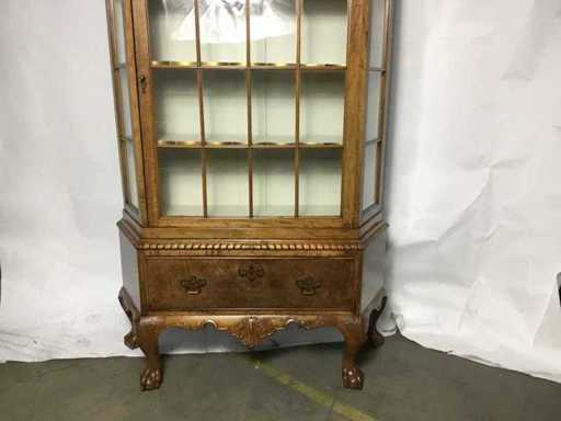 Górna część zawiera przeszklone drzwi z przegrodą prętową, przeznaczone do ekspozycji porcelany lub szkła. Dolna szafka ma jedną szufladę i opiera się na charakterystycznych zakrzywionych nogach, takich jak stopki w kształcie pazurów.