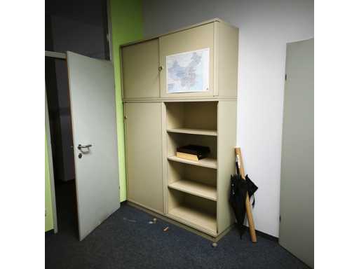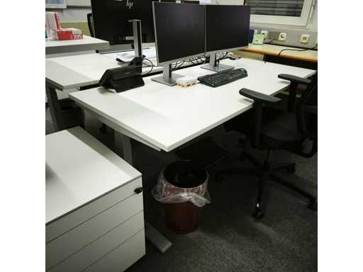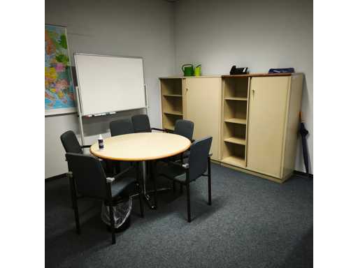 4x 1 800mm zmotoryzowane biurka podnoszenia i opadania; 6x różnych szafek z podwójnymi drzwiami; okrągły stół konferencyjny z 6 krzesłami; biurko z piedestałem; 2x mobilne postumenty; 5x krzesła; wieszak na płaszcze; wentylator stojący na podłodze; tablica mobilna; Grace Mobile system czystego powietrza. Wyłączone drukarki, komputery PC, telefony i stacje dokujące
