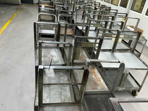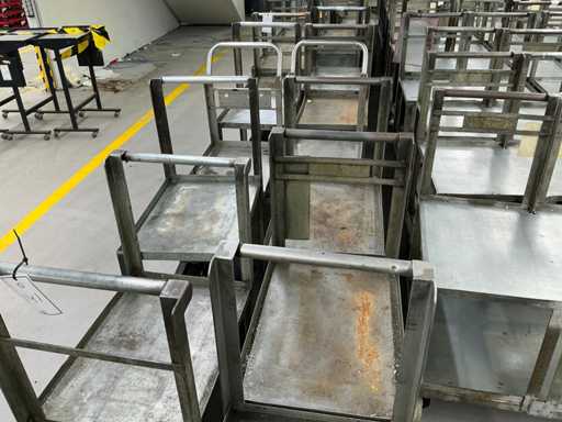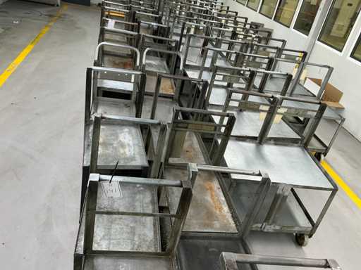 Set of 10 transport trolleys, with two reinforced shelves and tubular structure. Equipped with heavy-duty swivel wheels for easy movement in warehouses, workshops or production lines. All trolleys have metal push handles and both top and bottom usable surface.