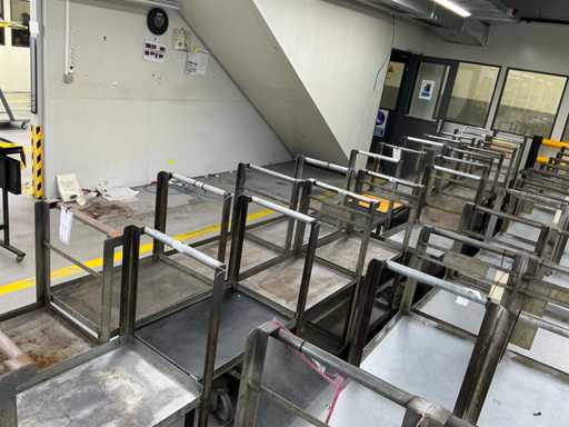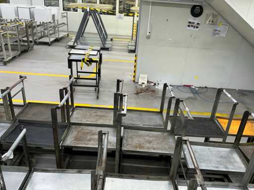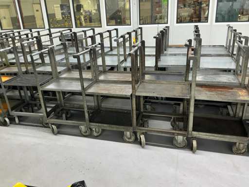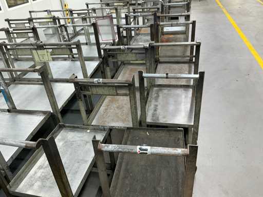 Set of 10 transport trolleys, with two reinforced shelves and tubular structure. Equipped with heavy-duty swivel wheels for easy movement in warehouses, workshops or production lines. All trolleys have metal push handles and both top and bottom usable surface.
