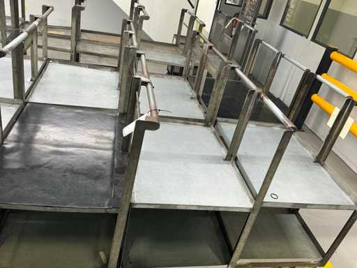Set of 6 transport trolleys made of steel, with robust structure and two shelves for loading. Equipped with swivel castors and push handles for easy mobility in warehouses, workshops or production lines.