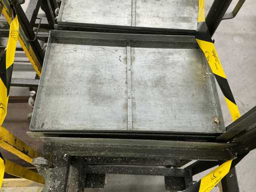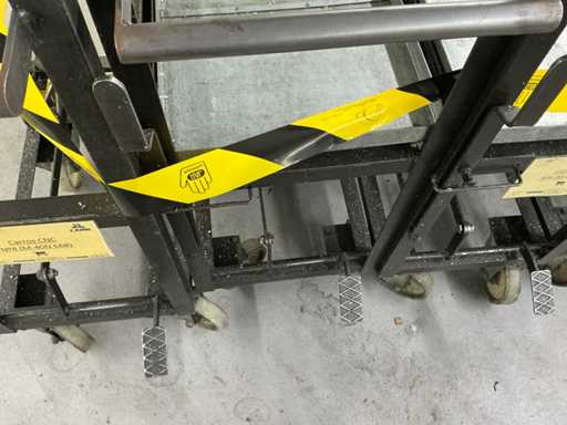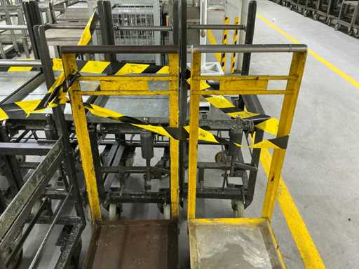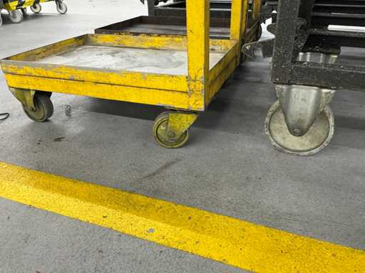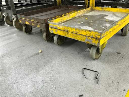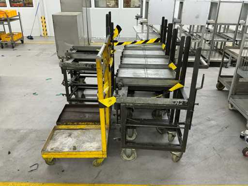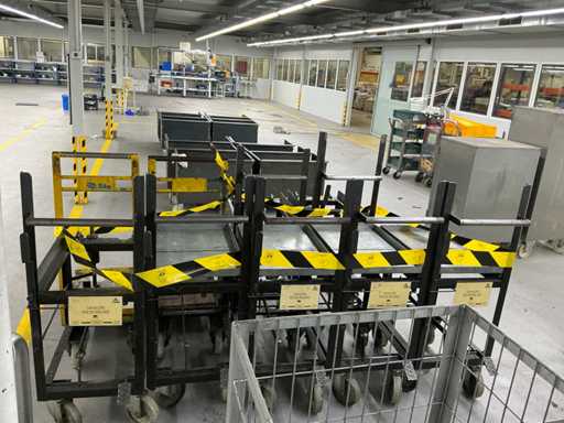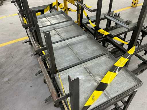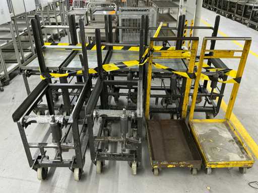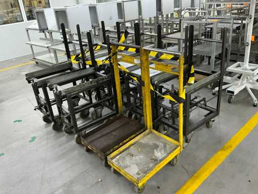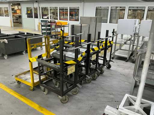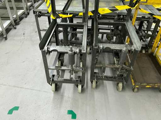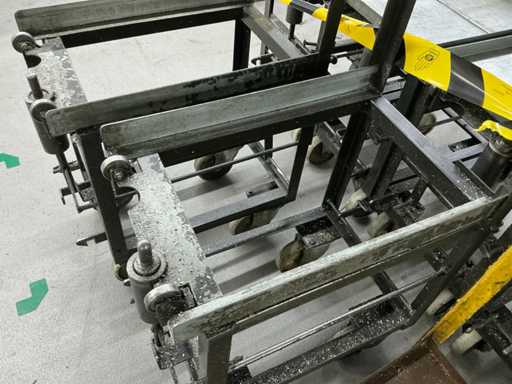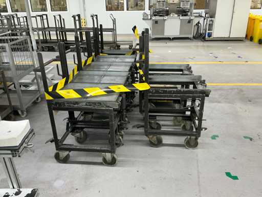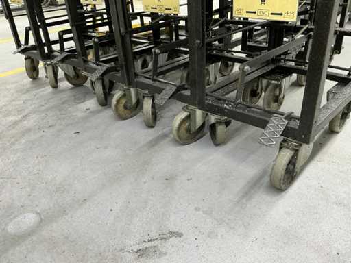 A set of metal trolleys with wheels, designed for transporting or supporting components in production environments.