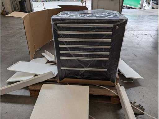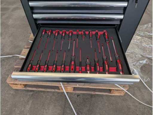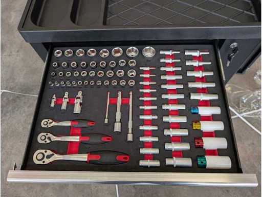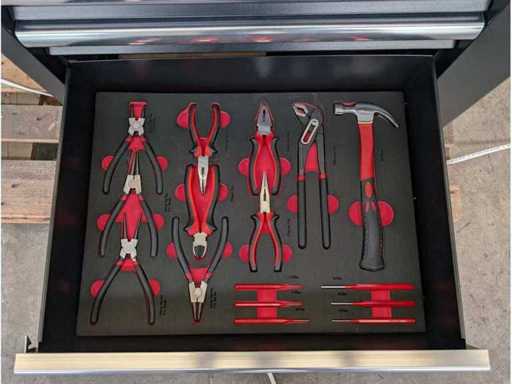 Profesjonalny wózek narzędziowy z zestawem narzędzi o pojemności 280 części. Maksymalna ładowność wózka 475 kg, maksymalna ładowność szuflady 35 kg. 7 szuflad z centralnym zamkiem na klucz.