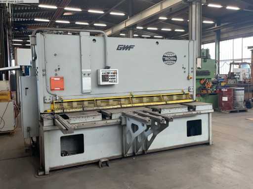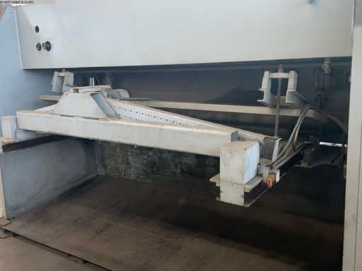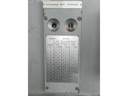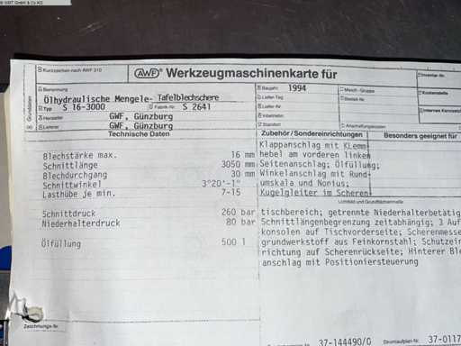 Hydrauliczne nożyce gilotynowe z>br>- Sterowaniem ELGO dla tylnego >br>- Regulacją kąta cięcia>br>- Regulacją długości cięcia>br>- Ograniczeniem długości cięcia (zależnym od czasu)>br>- Regulacją grubości blachy>br>- Tylnym rozstawem z funkcją swobodnego przemieszczania się>br>- Oświetlenie linii cięcia>br>- Boczne >stopbr br> - 3 części. wsporniki>br> w dobrym stanie>br> szerokość arkusza 3050 mm>br>grubość arkusza 16 mm>br>szerokość podstawy 3050 mm>br>głębokość 15-1000 mm>br>przystosowanie kąta cięcia tak>br>Regulacja szczeliny cięcia tak: mm>br> Obciążenie podłączone 30 kW>br>Waga maszyny ok. 14,5 t>br> Zapotrzebowanie na miejsce ok. 4,0 x 260 x 2,55 m