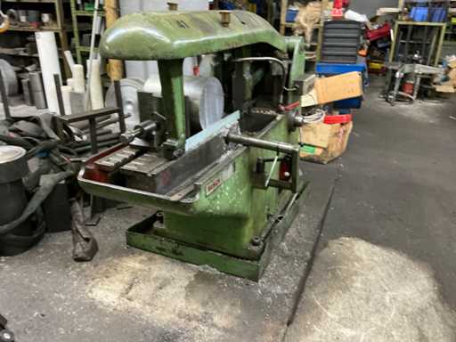- Construction: Cast iron frame, manual clamping, automatic saw feed