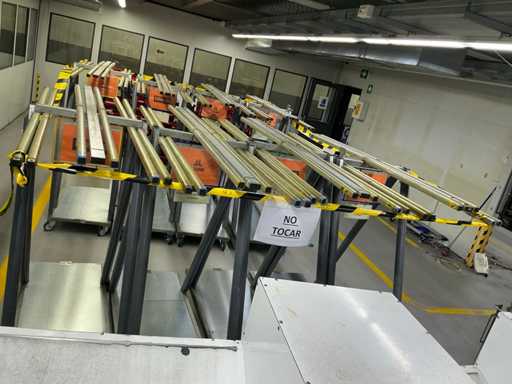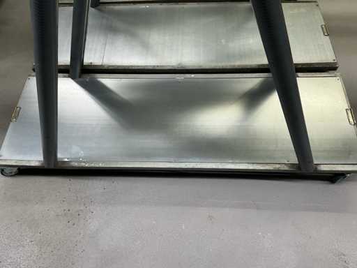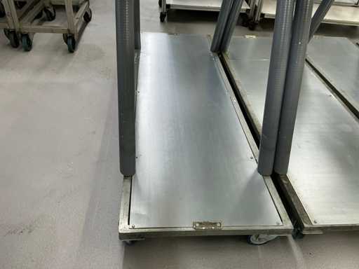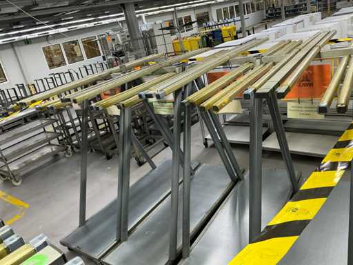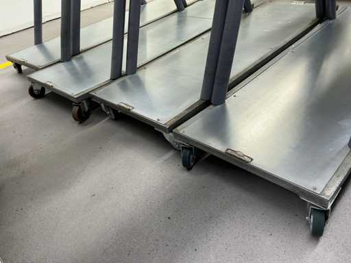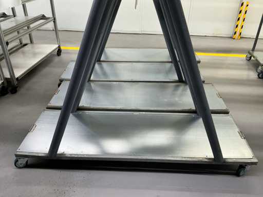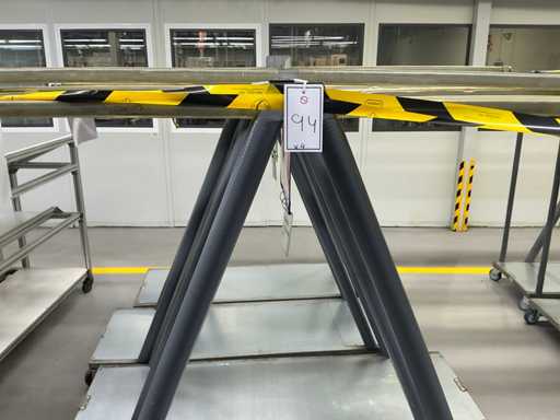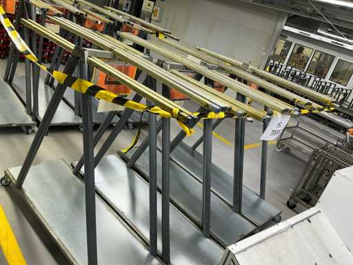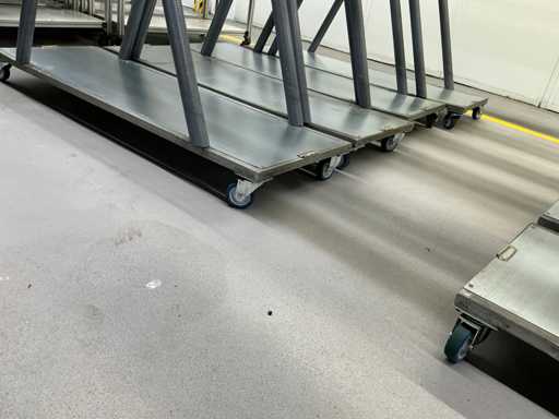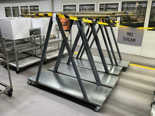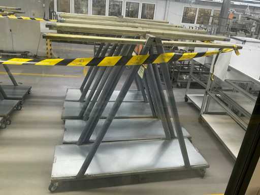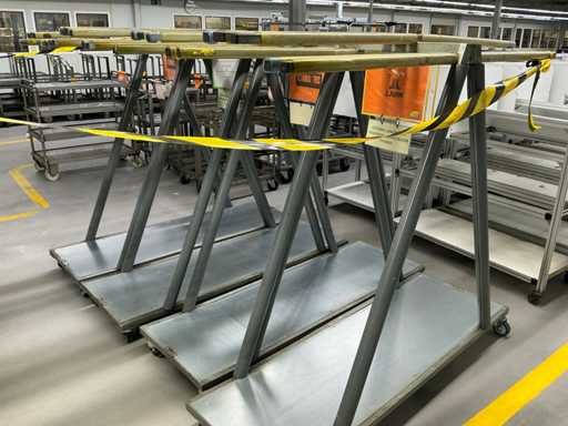 Set of metal trestle trolleys equipped with swivel wheels. Upper structure in the shape of an "A", designed for the transport or support of panels, flat parts or tools.
