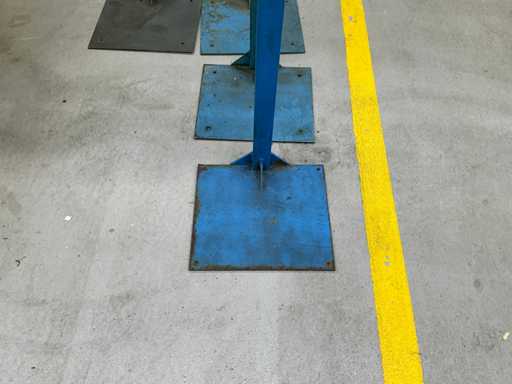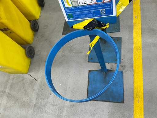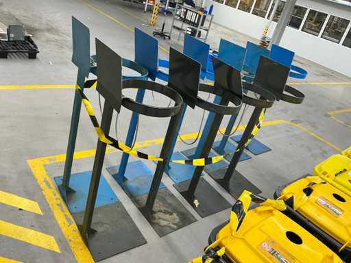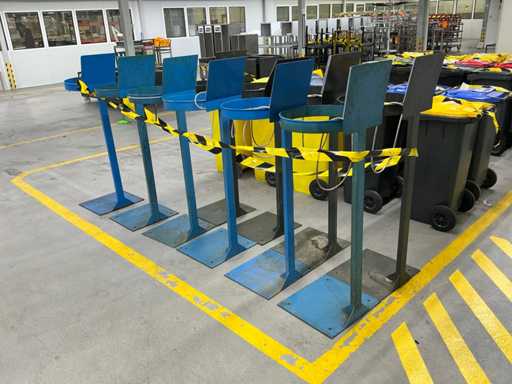 Batch of metal supports for waste containers, consisting of a square base, vertical tubular shaft and upper clamping ring for buckets or sacks.