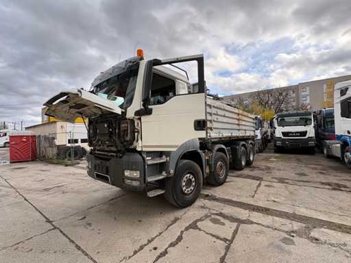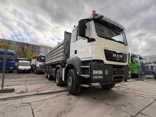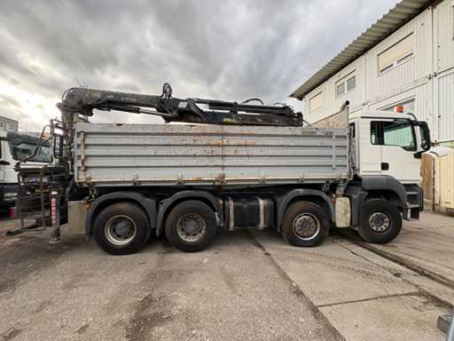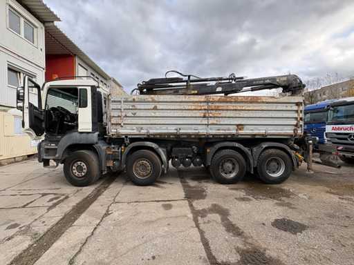 The used 4-axle crane truck of the type MAN TGS 35.440 8x4 BB from 2013, with HIAB crane and