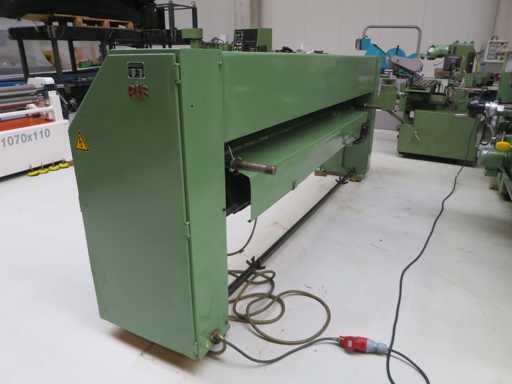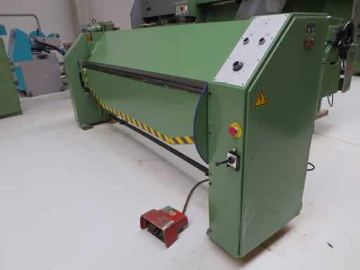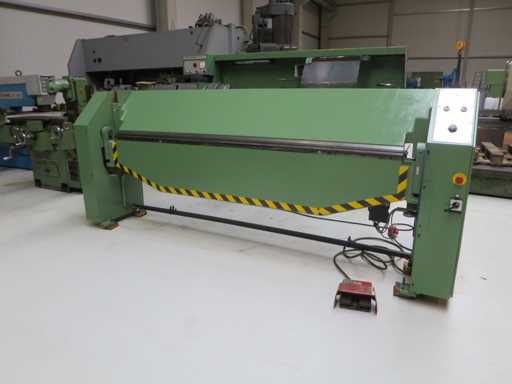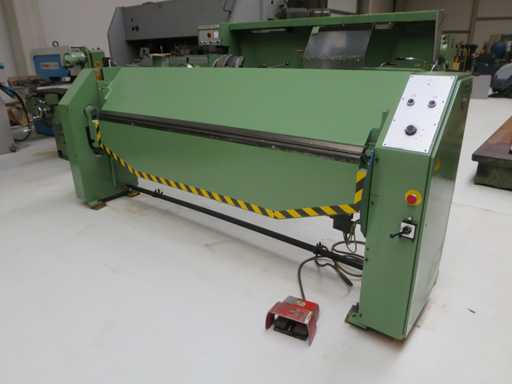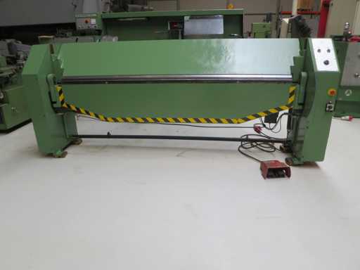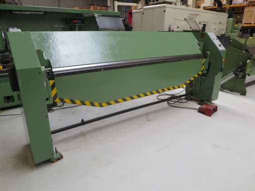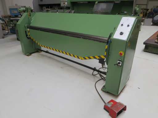 Obrotowa maszyna do gięcia z>br> mechanicznym tylnym przekątem>br> preselekcją kąta zginania>br> br> przełącznikiem nożnym>brszerokość arkusza 2540 mm>br>grubość blachy 2,5 mm>br>szerokość kolumny 2540 mm>br>szerokość otworu 200 mm>br>całkowite zapotrzebowanie na moc 2,0 kW>br> około 1,7 t>br> zapotrzebowanie na miejsce ok. 3,35 x 0,8 x 1,4 m