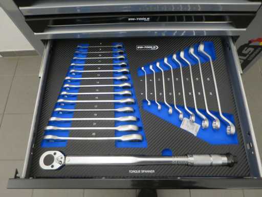 Combination wrench set (approx. 8–22 mm), double ring wrench set and torque wrench.