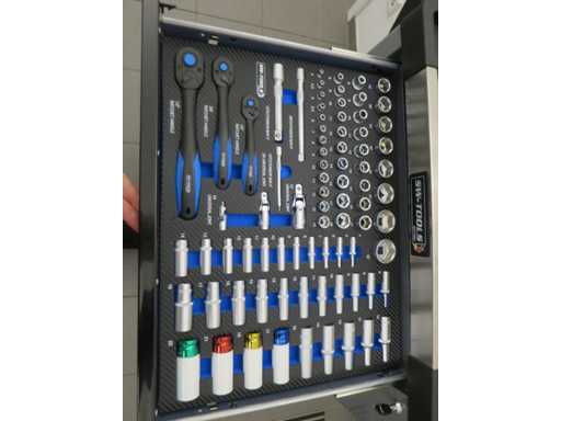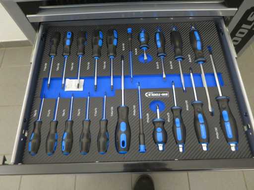 High-quality tool trolley with 8 ball-bearing drawers, 6 of which are fully equipped with tools. The trolley is lockable and equipped with 4 sturdy castors (2 steerable, 2 lockable) for comfortable and safe working. A robust polypropylene worktop completes the equipment.