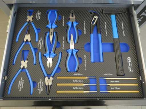 Pliers and hand tool set: Sea ring pliers (inside/outside), combination and needle-nose pliers, side cutters, pipe wrenches, batten hammer and centre punch set.