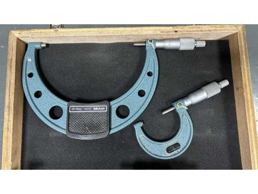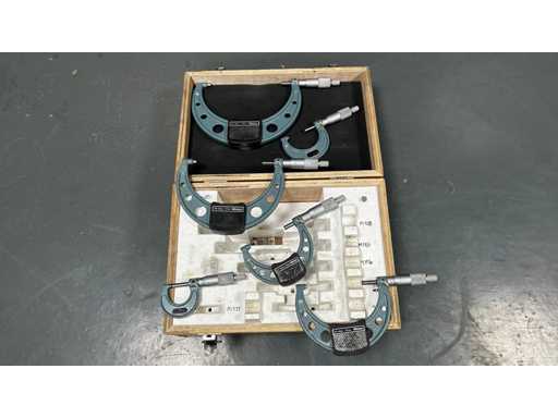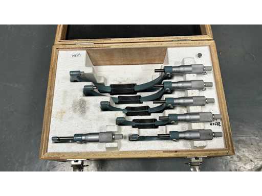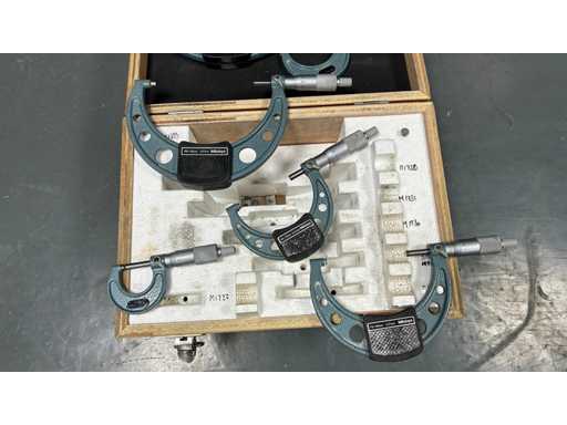 6 analogowych mikrometrów Mitutoyo • Zakresy: 0–150 mm • Dokładność±0,01 mm • Modele widoczne: 50–75 mm, 75–100 mm, 100–125 mm, 125–150 mm.