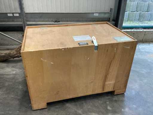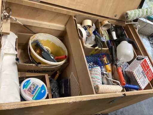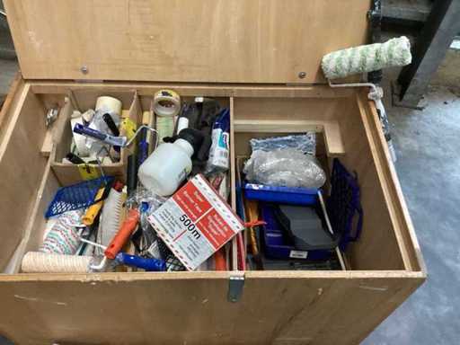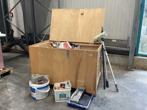 Różne narzędzia malarskie w drewnianej skrzynce z możliwością obsługi palety można przejechać pod spodem