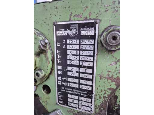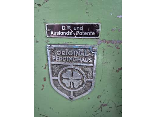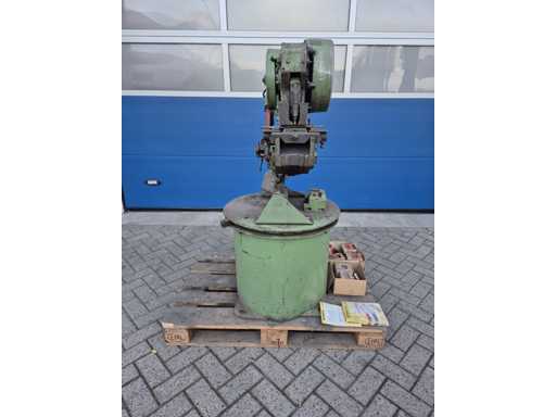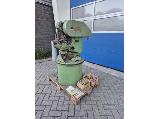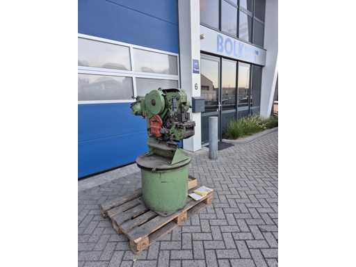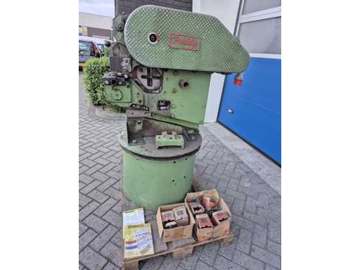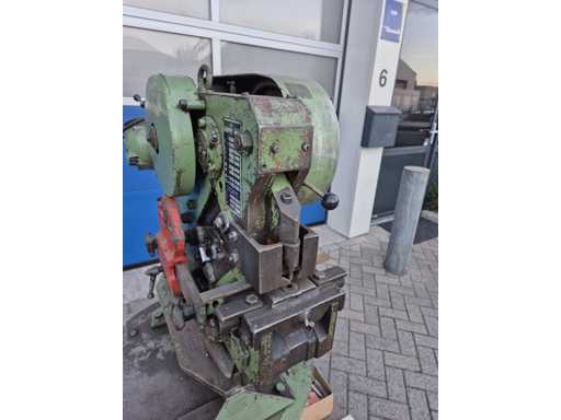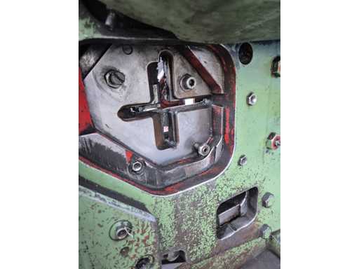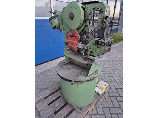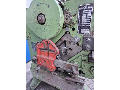 Mimośrodowa wykrawarka i nożyce Peddinghaus Peddy jest w dobrym stanie i kompletna, jak pokazano na zdjęciach. Maszyna jest natychmiast gotowa do użycia. Wyposażony w różne stemple i nadaje się do cięcia 80 x 10 mm, pełnego okrągłego 28 mm, pełnego kwadratu 25 mm i kątownika 70 x 70 x 7 mm. Zasilany silnikiem elektrycznym o mocy 1,5 kW przy napięciu 380 woltów. Solidna i niezawodna maszyna. Pod względem technicznym, optycznym i ogólnym maszyna jest w dobrym stanie i dlatego może być natychmiast użyta.