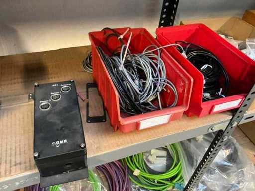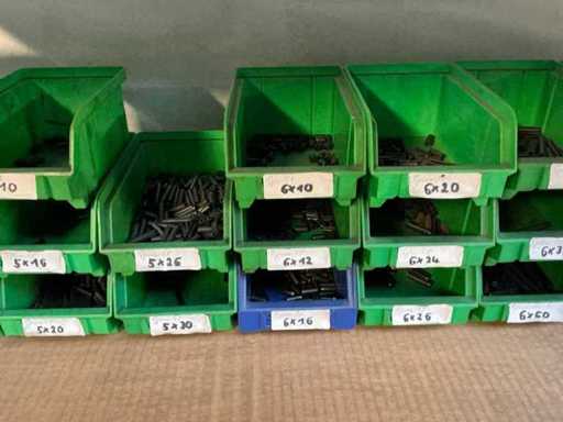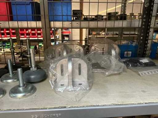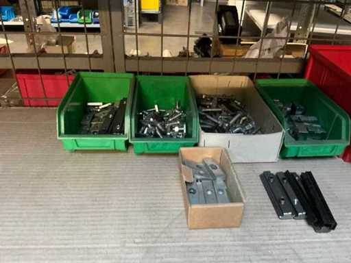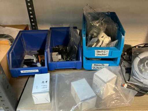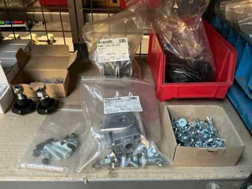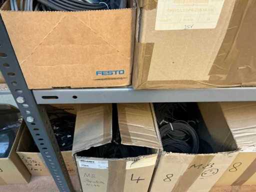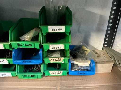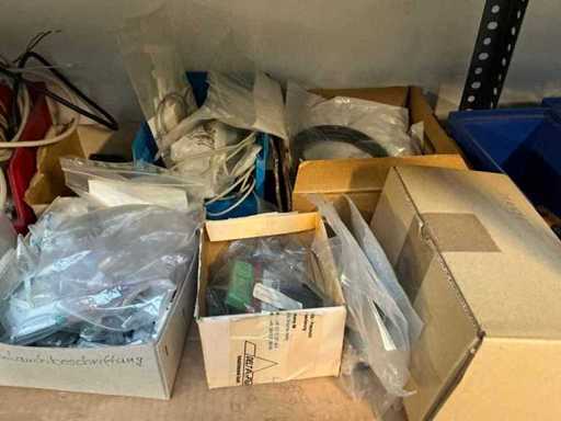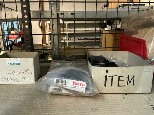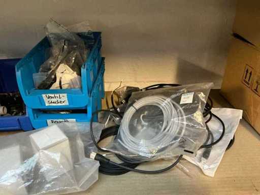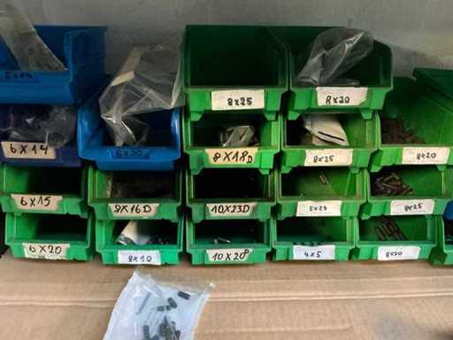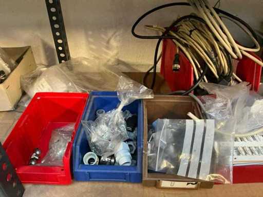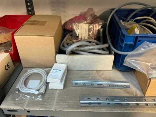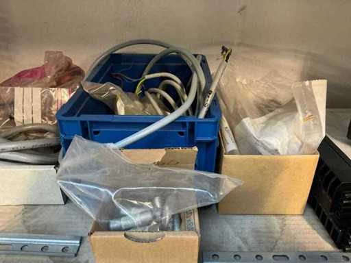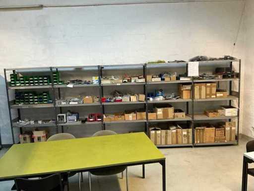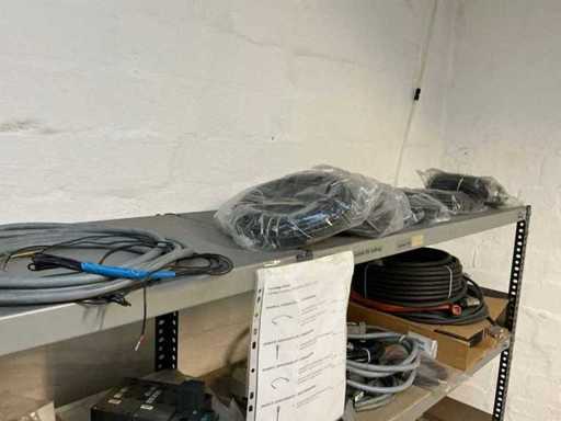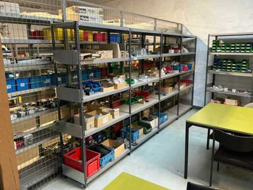 Stojak 1 t/m 4: materiały montażowe Bosch Rexroth; Półka 5: Sworznie zaciskowe, śruby do wbijania, szafy sterujące; Półka 6: Sterowanie i węże; półka 7 t/m 9: Specjalne kable Festo, Belden, Elcon. Abm. Półka na przedział: 100x40x192 cm