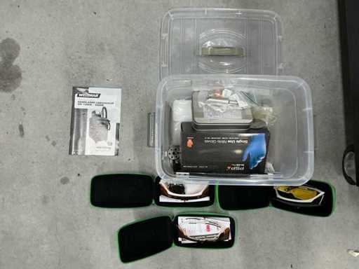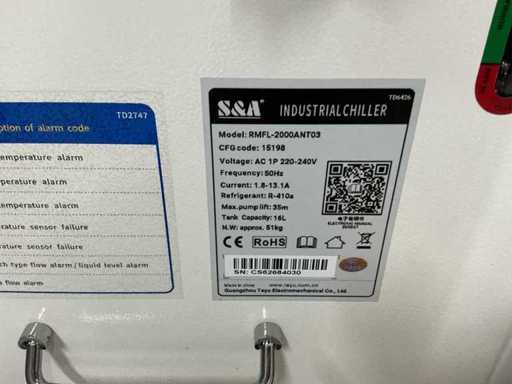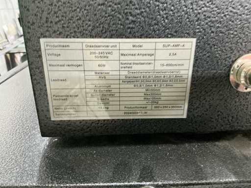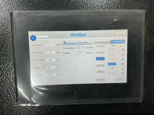Wyposażona w: 3 okulary, kontrolę nogą. Ręczna laserowa spawarnica Weldkar model WK2000 (data budowy marzec 2024) z mocą 2000W, chłodzeniem wodnym, trójfazowym, zainstalowaną mocą ≤10 kW, wymiarami 1440×680×1160 mm i wagą 255 kg, w tym podawacz przewodów (model SUP-AMF-A) o napięciu 200–240V, maks. 2,5A i 60W, prędkość podawania drutu 15–600 cm/min odpowiednia dla stali nierdzewnej i drutu aluminiowego Ø0,8–1,6 mm (szpula do Ø300 mm, ±20 kg).