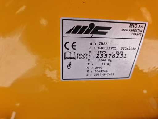 - Ręczny wózek paletowy MIC TM 22: numer seryjny 23576231, rok produkcji 2003, ładowność 2200 kg, wymiary widelca 1150 x 520 mm.